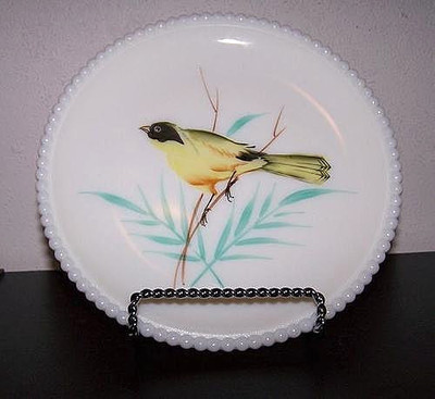 Title (ebay affiliate link): 1940's Westmoreland Milk Glass Beaded Edge HP Yellow Warbler Song Bird 7" Plate