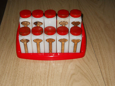 Title (ebay affiliate link): VINTAGE COMPLETE SET OF 10 MILK GLASS SPICE JARS RED METAL CAPS SHAKERS IN RACK