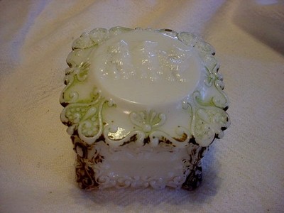 Title (ebay affiliate link): Antique Milk Glass Dresser Trinket Box w/ Three CATS on Lid