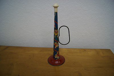 Title (ebay affiliate link): Vintage Antique Tin Litho Noise Maker Horn with Wood Mouthpiece