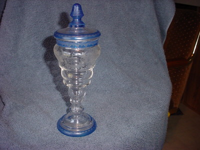 Vintage Clear & Blue Etched Glass Decanter Bottle Display With Lid