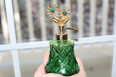 Beautiful Old Green Perfume Bottle with Rhinestone Flowers Irice ?