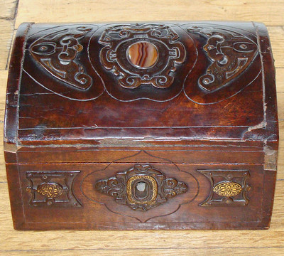 Title (ebay affiliate link): Large Antique French ART NOUVEAU Walnut Box CASKET Damascene Iron Agate Mounts