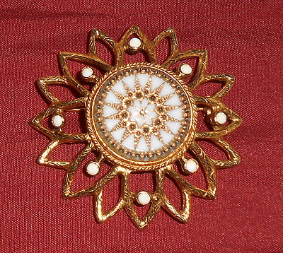 Vintage Gold Tone & Milk White Glass Brooch ~ Sun Center