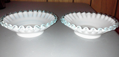 VINTAGE MILK GLASS BOWLS (2) SCALLOPED AQUA TRIM CREST