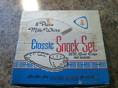 VTG ANCHOR HOCKING CLASSIC 8 PC MILK GLASS WHITE SNACK SET 22K GOLD EDGE IN BOX