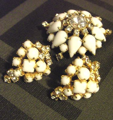 Vintage Brooch and earrings with White Milkglass and Rhinestones