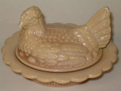 AMBER & MILK SLAG GLASS HEN CHICKEN ON NEST BASKET DISH