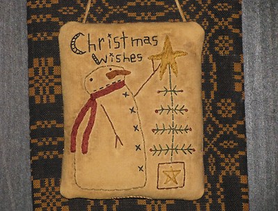 Title (ebay affiliate link): Primitive Stitchery Hanger ~ Christmas Wishes~ Snowman Decorating Tree