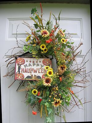 Title (ebay affiliate link): Halloween Vintage looking Greetings Sign, Floral Door Wreath