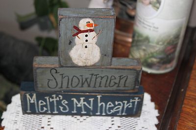 Title (ebay affiliate link): Primitive Winter/Christmas Wood Block Shelf Sitter (SNOWMAN MELTS MY HEART )