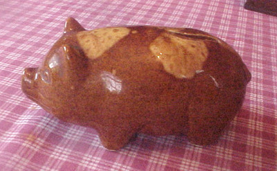 Title (ebay affiliate link): ANTIQUE POTTERY SPONGEWARE PIG BANK BROWN & YELLOW USA