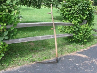 Title (ebay affiliate link): Antique Vintage Hay Grain Sickle Scythe Farm Tool Primitive Grim Reaper Decor