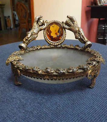 ** RARE ANTIQUE ASHTRAY WITH CUPIDS & AMBER COLORED STONE **