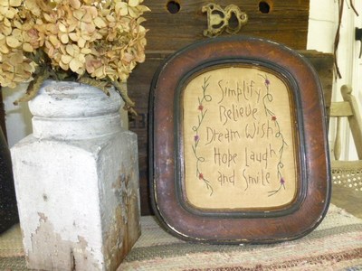 prim stitched aged sampler ~ unique antique wood frame ~ Sentiments & Vines