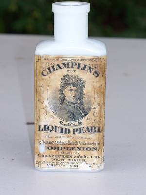 Milk Glass Champlins Liquid Pearl Bottle w/ Full Labels