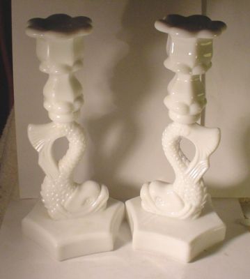 Vtg WESTMORELAND Dolphin Candlesticks Milk Glass ExCond