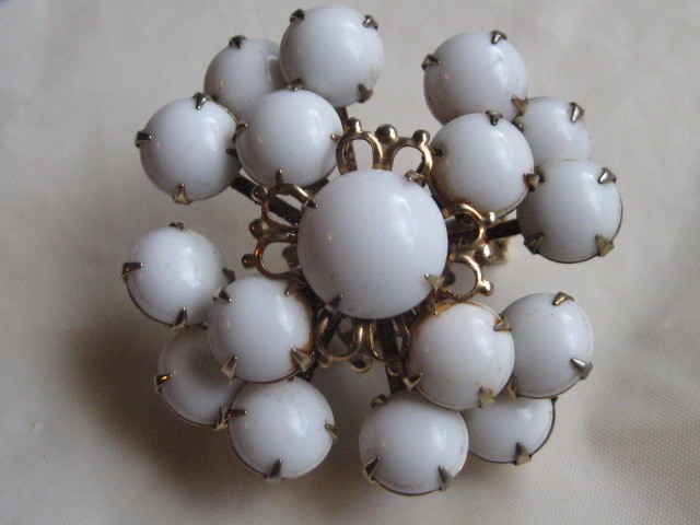 VINTAGE WHITE MILK GLASS BEAD TIERED BROOCH PIN