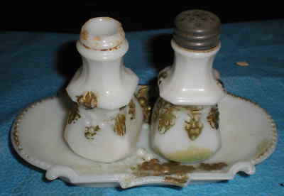 ANTIQUE MILK GLASS SALT AND PEPPER SHAKER WITH TRAY (a)