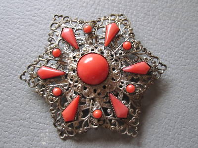 Title (ebay affiliate link): LARGE ANTIQUE VICTORIAN CORAL PIERCED METAL BROOCH PIN
