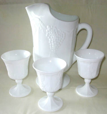 3 INDIANA MILK WHITE GLASS GRAPE WINE GOBLETS & PITCHER