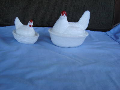 WESTMORELAND WHITE MILK GLASS TWO HENS ON DISH RED HEAD
