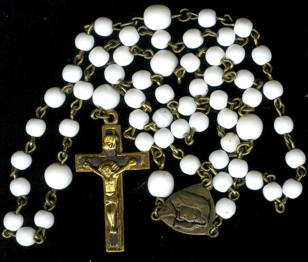E91 Antique brass ROSARY w/ MILK WHITE GLASS beads