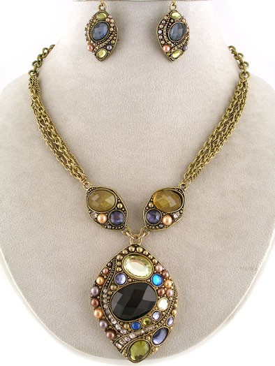 Title (ebay affiliate link): Antique Brass Crystal Faux Pearl Statement Necklace Set