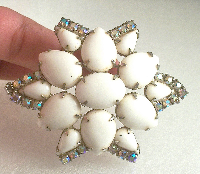 Vintage Milk Glass AB Rhinestone Brooch