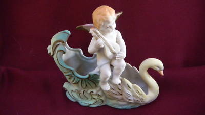 OCCUPIED JAPAN ANGEL SITTING ON A SWAN BISQUE 6" L 6" T