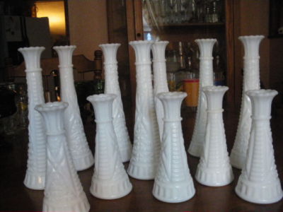 SET OF 12 MATCHING MILK GLASS VASES 9 IN. & 6 IN TALL