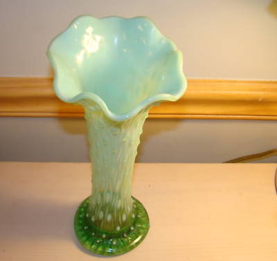 Hobnail Green Opalescent Milk Glass Vase Ruffle Rim VTG