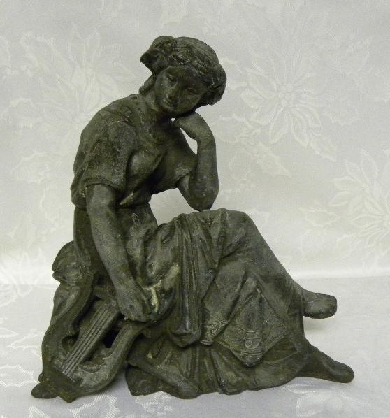 ANTIQUE SPELTER LADY WITH LYRE STATUE CLOCK TOP