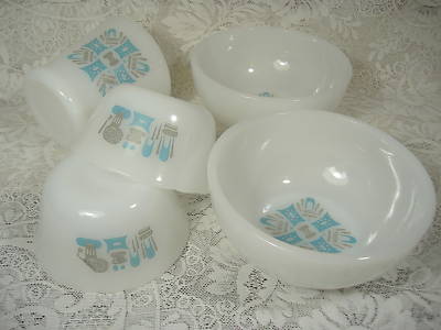 5 pcs FIRE KING BLUE HEAVEN MILK GLASS MUG & BOWLS