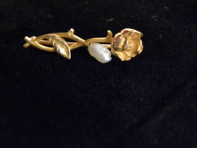 Antique 10k Solid Gold Rose Brooch w/ Natural Pearl