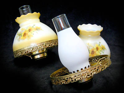 PAIR OF SUNFLOWER MILK GLASS SHADES W/FIXTURES & GLOBES