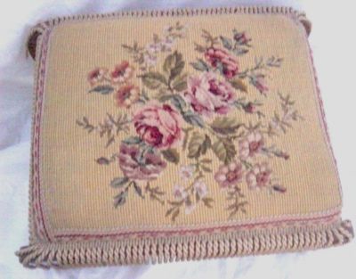 Title (ebay affiliate link): SHABBY ANTIQUE CHIC NEEDLEPOINT FOOTSTOOL ROSES FRINGE