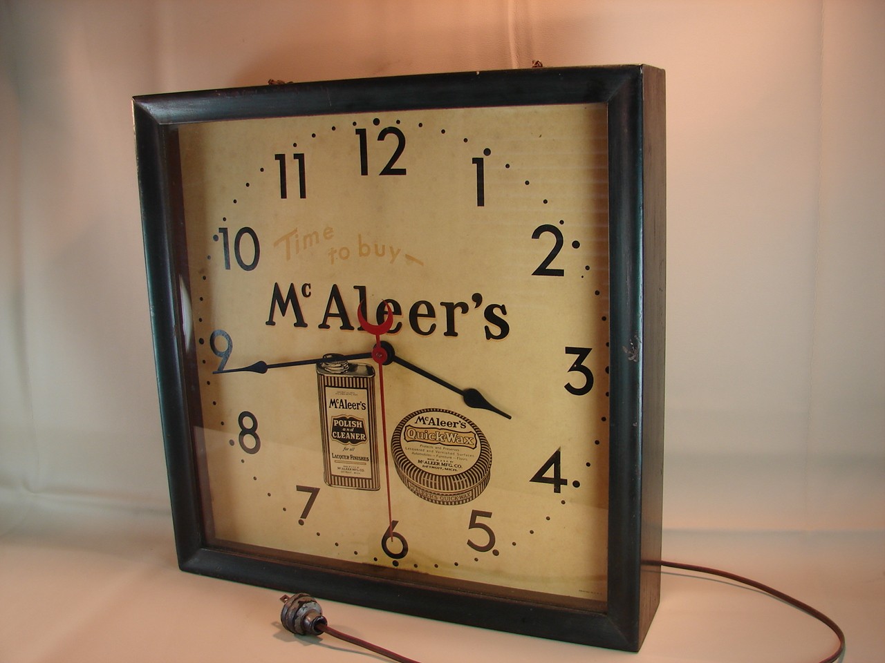Title (ebay affiliate link): VTG Antique McALEER'S ADVERTISING ELEC WALL CLOCK LARGE