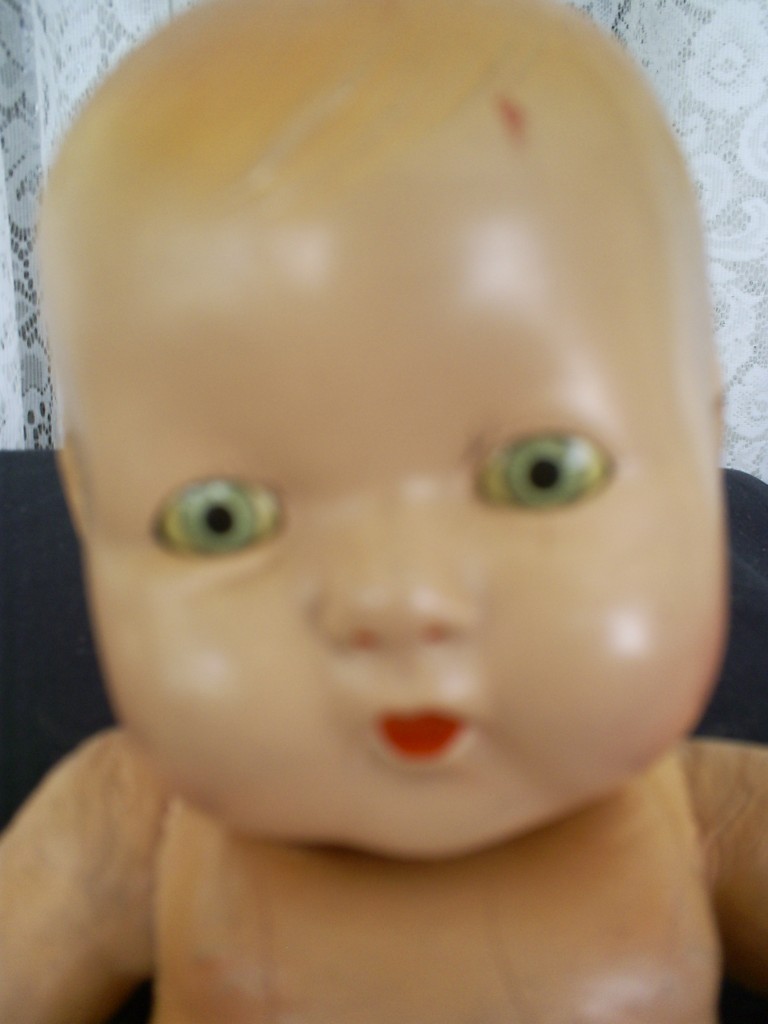 Title (ebay affiliate link): ANTIQUE COMPOSITION & RUBBER BABY DOLL TIN EYES CLOTHES