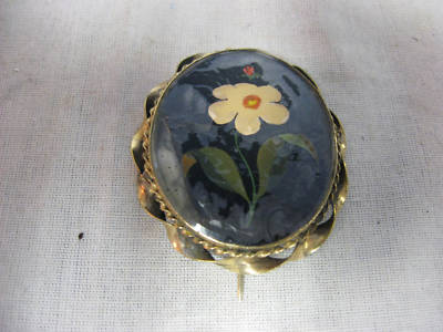 Title (ebay affiliate link): Antique Oval Shaped Flower on Black Brooch w Gold Trim