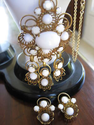 Milk Glass Antique Gold Metal Demi-Parure Retro