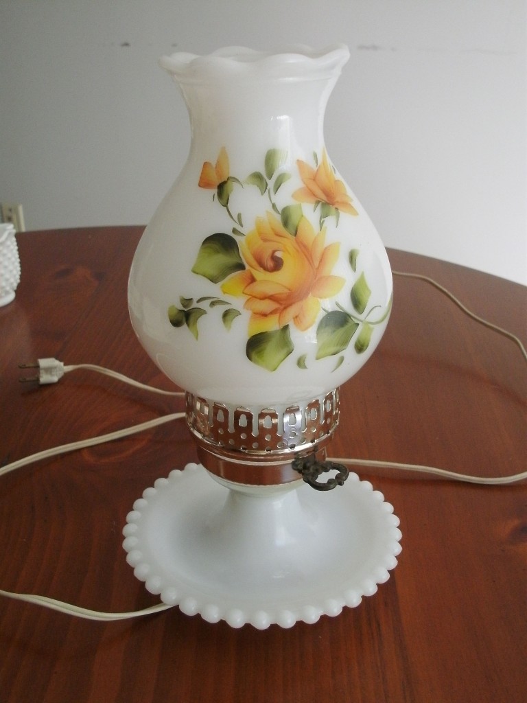 MILK GLASS HURRICANE LAMP -HAND PAINTED YELLOW ROSES