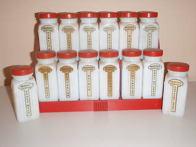 GRIFFITH'S 12 MILK GLASS SPICE JARS WITH RACK/+2EXTRA