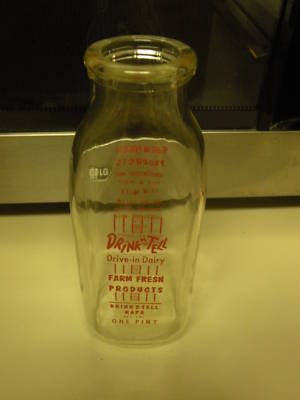 VINTAGE DRINK-N-TELL DRIVE IN DAIRY MILK BOTTLE PINT NR