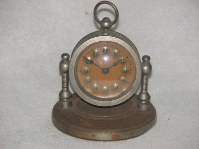 SMALL ANTIQUE DESK OR DRESSING TABLE METAL CASED CLOCK
