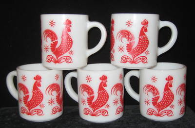 Lot of 5 Red Rooster Print Milk Glass Coffe Mugs Cups