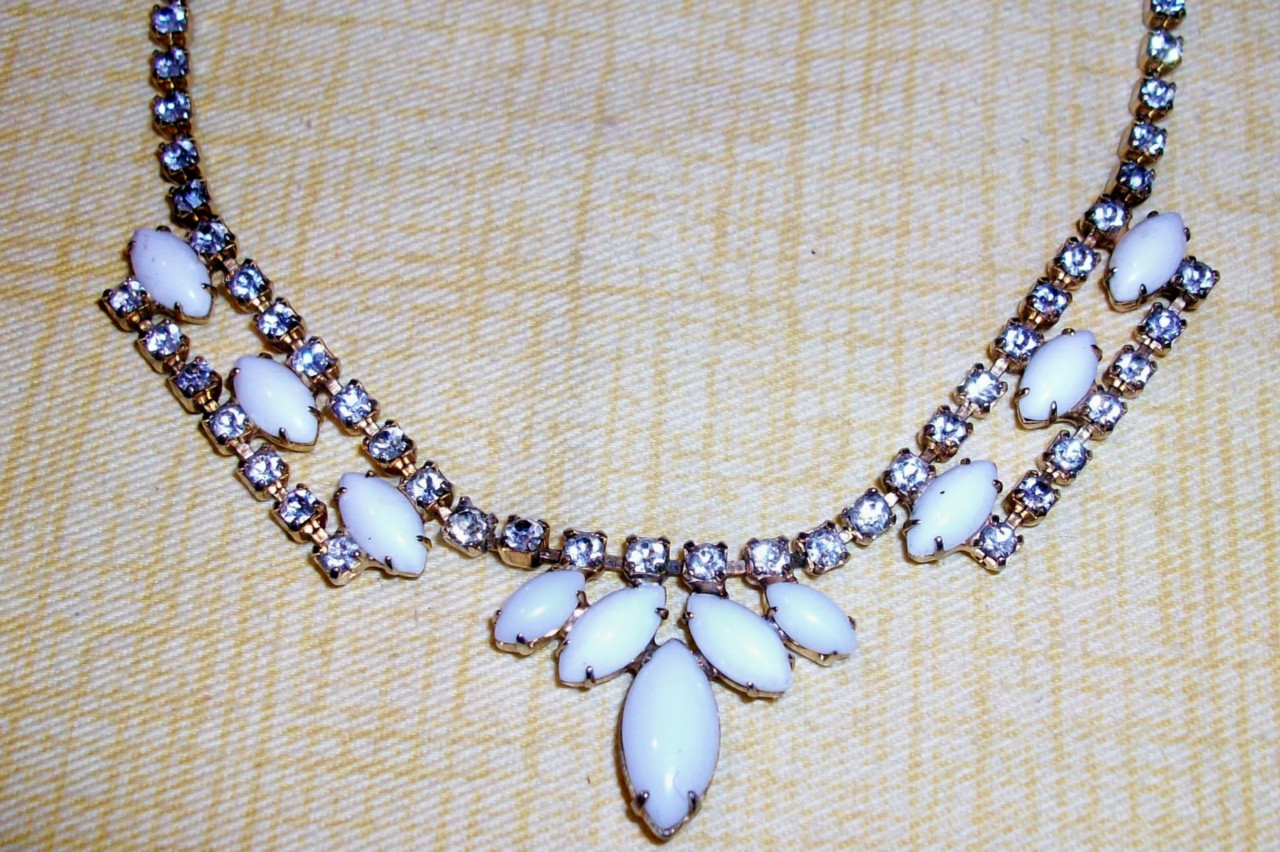 Vintage Clear Rhinestone & Milk Glass Navette Necklace