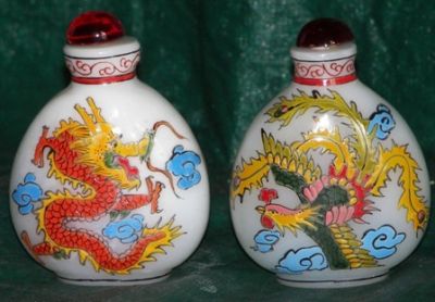 2 milk glass snuff bottles phoenix/dragon design