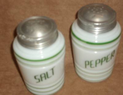 White ATLAS Milk glass GREEN STRIPE Shaker set salt old