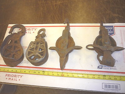 Title (ebay affiliate link): 4 OLD ANTIQUE STEEL HAY BARN TROLLEY ROPE PULLEYS